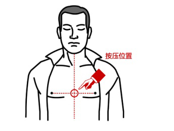 4. 确认患者没有正常呼吸,将一只手的掌根放在患者胸部的中央(两乳头连线中点),将另一只手的掌根置于第一只手上,伸直双臂,双肩位于双手正上方。按每分钟100至120次频率,用力按压, 按压深度5至6厘米。